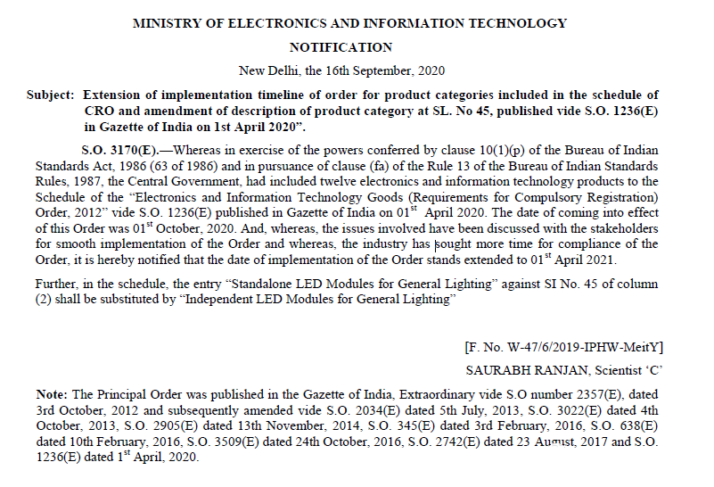 On September 16, 2020, BIS issued an official document, emphasizing the following: 1. The implementation time of the fourth batch of CRO compulsory certification products has been delayed MeitY decided to extend the implementation time of the fourth batch of CRO compulsory certification products from October 1, 2020 to April 1, 2021. 2. Amendment to the product description of item SI No. 45 The entry \"Standalone LED Modules for General Lighting\" in column (2) SI No.45 in the April 1, 2020 notice should be replaced with \"Independent LED Modules for General Lighting\".